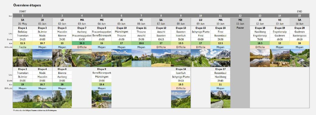 Programme détaillé de tout le parcours "ViaBerna" planifié selon l’agenda original, avec historique de chaque journée de marche avec les participants. Toutes les images et information des parcours proviennent du site © 2025 Berner Wanderwege: https://www.viaberna.ch/fr/viaberna